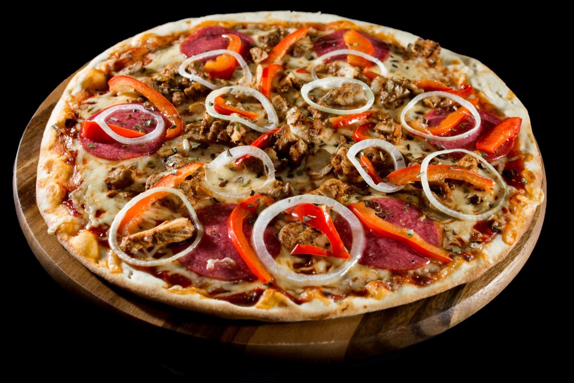 Padažas, sūris, saliamis, rūkyta vištiena, šviežios paprikos, svogūnai, raudonėliai