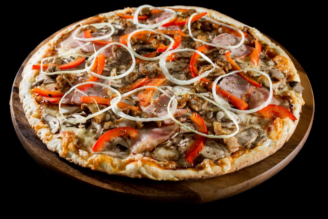 Padažas, sūris, pievagrybiai, kumpis, šoninė, vištiena, šviežios paprikos, svogūnai, raudonėliai
